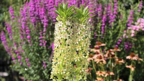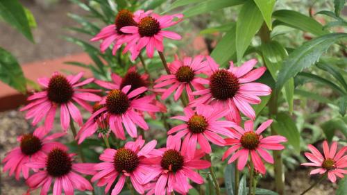 直線的なレイアウトにすることで、色とりどりの花や背の高い植物をバランスよく植えることができるのもポイントです。